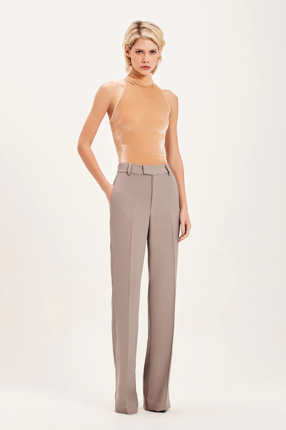 Regata em veludo com brilho suave, decote nadador e gola alta. Possui cava maior e modelagem justinha ao corpo. Abertura em gota arrematada por abotoamento na parte de trás do decote.