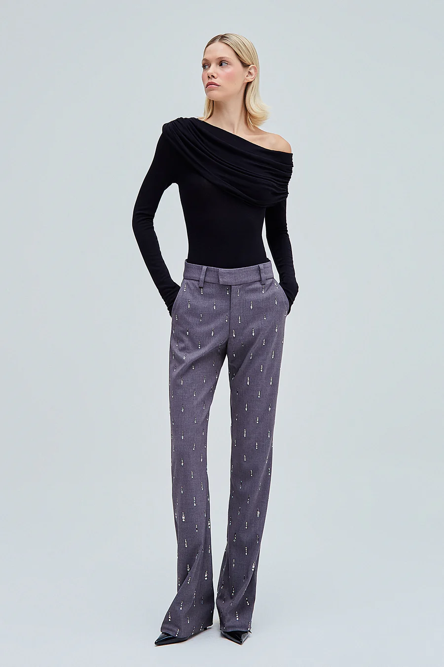 Blusa em malha com elasticidade e toque macio. Modelagem ajustada ao corpo. Possui decote um ombro só com detalhes drapeados e manga longa. Não possui fechamento.